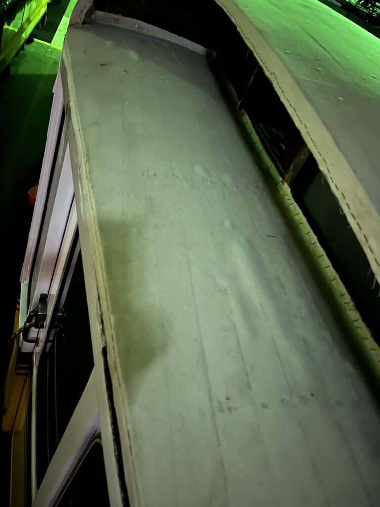 Als erstes noch ein Blick auf die nun vollständig wiederhergestellte Dachlattung der B-Plattform. Wir finden, dass uns das schonmal sehr gut gelungen ist. 🙂 (Foto: Rüdiger Grabowski)Nun begann ein längerer Arbeitsabschnitt, bei dem unzählige Schraubenlöcher, kleinere Risse und Fehlstellen zu verspachteln waren. Dies sah dann erst einmal so aus. (Foto: Rüdiger Grabowski)