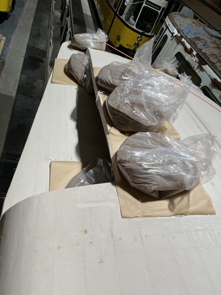 Inzwischen haben wir die gesamte äußere Dachfläche unseres Tw 276 dreimal mit Klebelack gestrichen, sie zeigt sich jetzt in einem schönen Glanz, den allerdings später niemand sehen wird. Schließlich kommt ja noch die eigentliche Dachbespannung darauf, und diese müssen wir nun vorbereiten. Sie besteht aus Leinentuch, so wie dies auch bei klassischen Segelschiffen für die Fortbewegung genutzt wurde und wird, dementsprechend sind ausreichend große Stoffbahnen glücklicherweise heute noch im Fachhandel erhältlich.