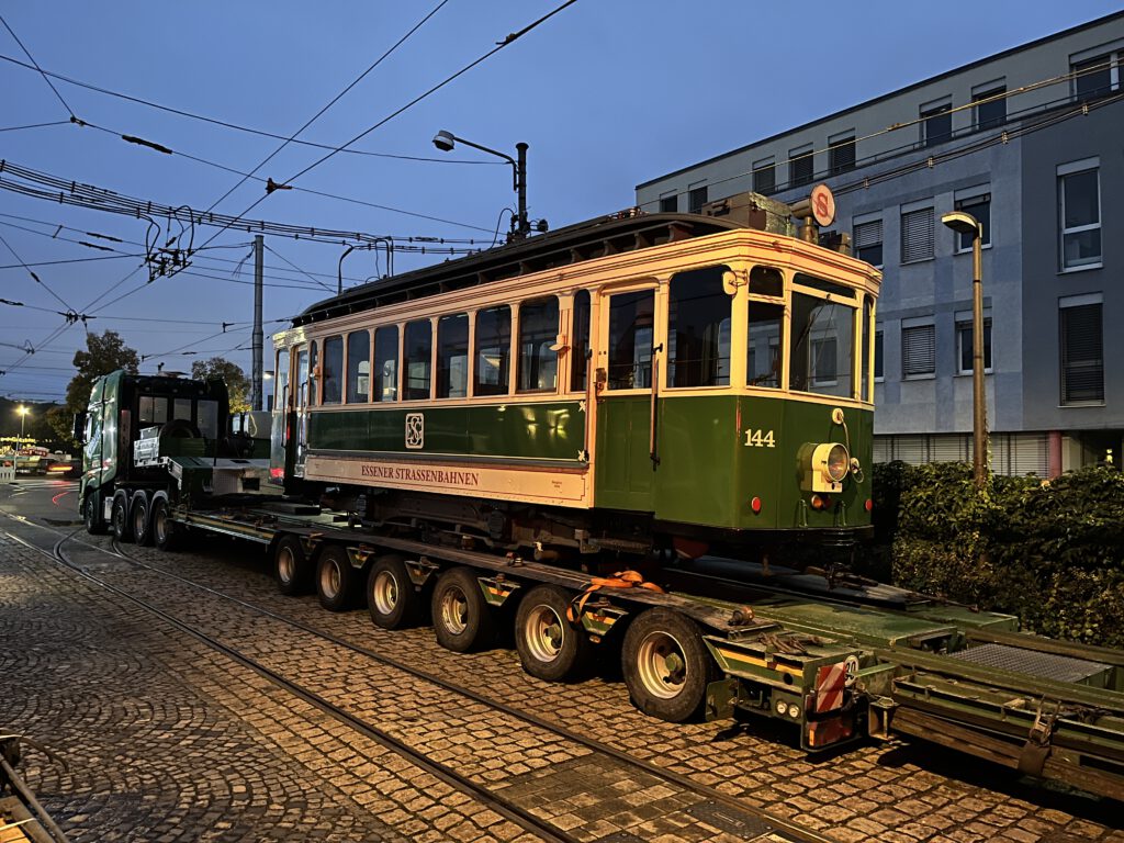 In gut einer Woche feiern wir nicht nur 130 Jahre elektrische Straßenbahn in Stuttgart, auch der 100. Geburtstag unseres Triebwagens Nr. 418 wird ausgiebig mit einem Festwochenende im Straßenbahnmuseum (18./19.10.) gewürdigt. Ein im wahrsten Sinne des Wortes „gewichtiger“ Geburtstagsgast traf heute Nacht in Cannstatt ein – Triebwagen 144 der Ruhrbahn in Essen.