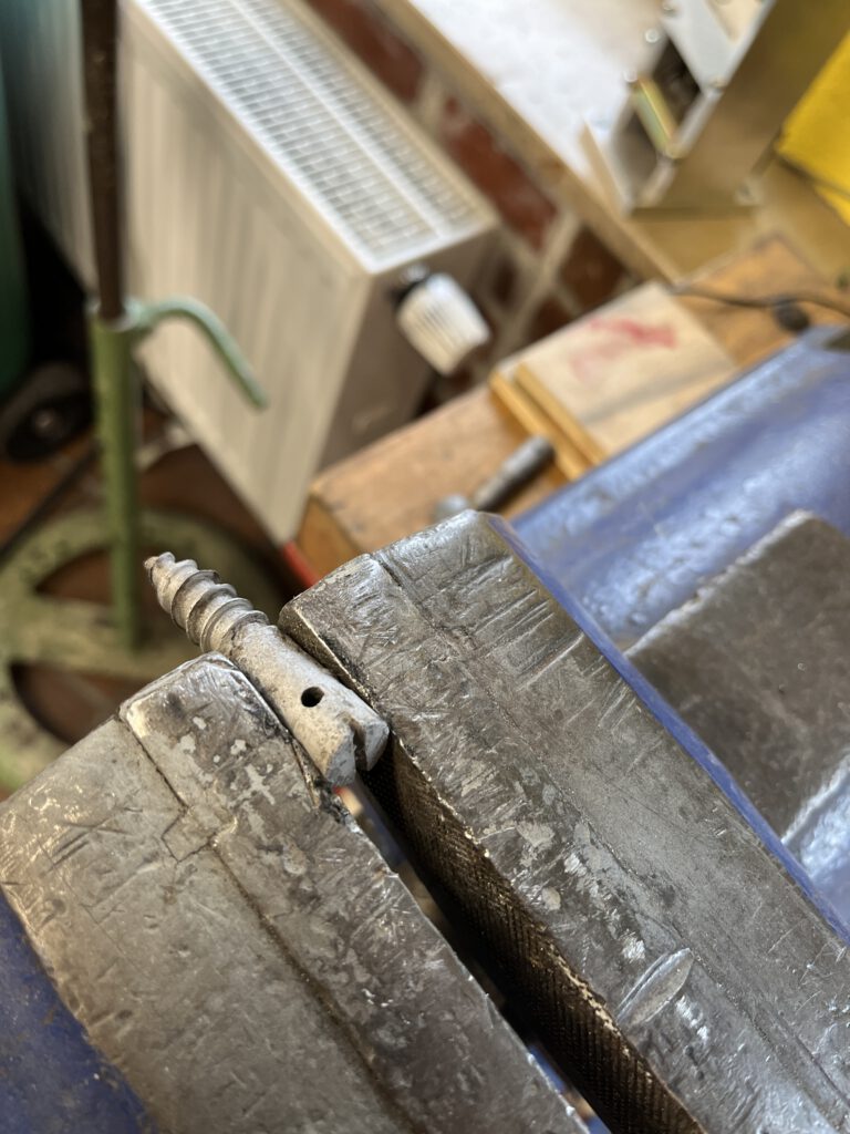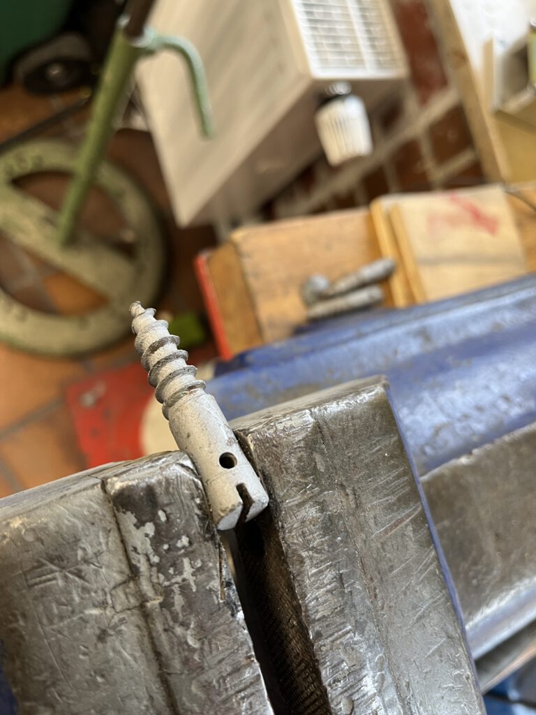 Zuerst haben wir die Schrauben sandgestrahlt, dann die zugesetzten Splintlöcher ausgebohrt, beides ist hier schon erfolgt. Dann mussten aber noch die Schlitze von Schmutz und alter Farbe gereinigt werden, damit die Schrauben später wieder angezogen werden können. (Foto: Rüdiger Grabowski)