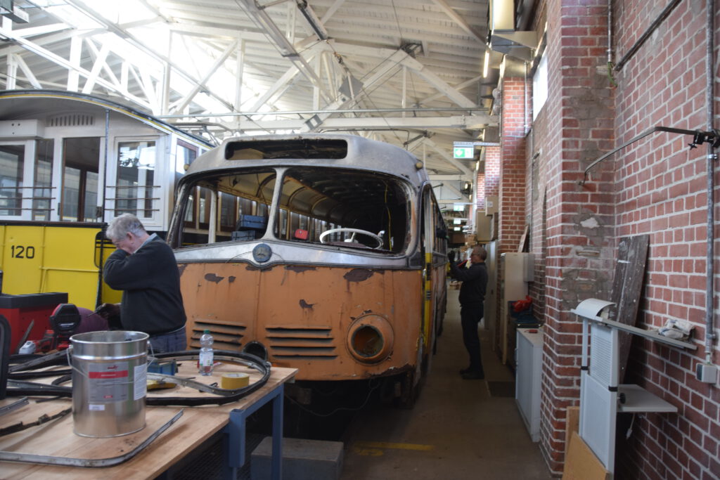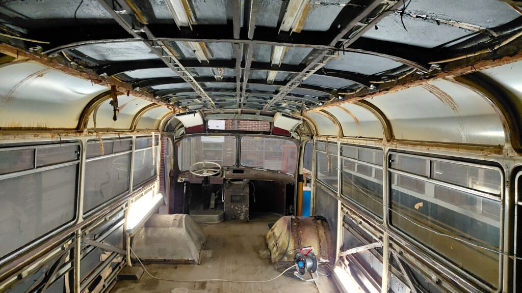 Als erster Schritt der Restaurierung des Mercedes-Benz O 6600 H erfolgt seit Beginn des Jahres die weitgehende Demontage des Fahrzeugs bis auf die grundlegende Karosseriestruktur. Die Arbeiten im Innenraum sind bereits weit fortgeschritten – das Fahrzeug ist inzwischen nahezu vollständig entkernt.