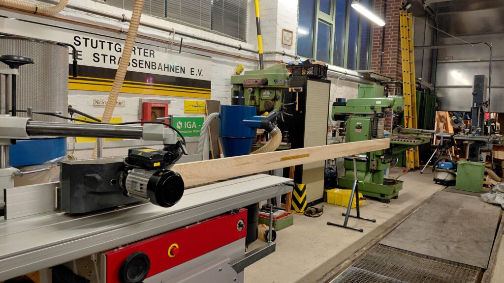 Zuerst haben wir die Stützen für die Widerstandsrahmenträger an unserer Bandsäge grob zugesägt. Von diesen benötigen wir insgesamt 18 Stück, zwei davon in doppelter Dicke, alle aus Eschenholz gefertigt. Anschließend folgen in gleicher Weise die Laufbrettstützen, das sind 34 Stück in unterschiedlichen Ausführungen. (Foto: Alexander Blank)Allen genannten Teilen ist gemein, dass sie auf dem gewölbten Teil des Wagendachs verschraubt werden, also an der Unterseite eine konkave Rundung erhalten müssen. Diese wird anhand eines Musterstücks auf dem neuen Träger angezeichnet, der dann mit Hilfe unseres Bandschleifers auf Maß gebracht wird. Auch bei der Herstellung der Außenradien ist die Maschine sehr hilfreich. (Foto: Alexander Blank)Nach dem Bohren und Senken sind die Halter für die Widerstandsrahmenträger schon bereit für die Probemontage auf dem Wagendach. (Foto: Rüdiger Grabowski)Und los geht’s: Zuerst haben wir die neuen Stützen mittig über den Dachspriegeln positioniert, mit denen sie verschraubt werden, anschließend haben wir sie mit einer Vorrrichtung symmetrisch zur Wagenlängsachse ausgerichtet und die korrekte Position angezeichnet. Dann vorbohren, verschrauben – und die Stütze sitzt. (Foto: Rüdiger Grabowski)Wenige Stunden später sind alle Stützen für die Widerstandsaufnahmen montiert. Die doppelten Träger (links an 3. Position, rechts an 7. Position) brauchen wir, da es die Tragebohlen im Jahr 1952 in der erforderlichen Länge nicht „am Stück“ gab, sondern jeweils 1x geteilt, das machen wir natürlich wieder genau so. (Foto: Rüdiger Grabowski)Und hier sind die Bohlen selbst schon in Arbeit, sie werden ebenfalls aus Eschenholz neu hergestellt. Für die Montage eines Abdeckblechs für den Kabelkanal gibt es über die gesamte Länge einen Absatz, den wir hier bei den kürzeren Bohlen bereits gefräst haben. Die Endenbearbeitung für den Anschluss des weiterführenden Kabelkanals (rechts an der „Vorlage“ zu sehen) machen wir später, wenn wir die genaue Länge der Bohle am Fahrzeug ermittelt haben. (Foto: Alexander Blank)Die beiden langen Bohlen reizen mit 4,30m Länge den in unserer Werkstatt verfügbaren Platz beinahe restlos aus, aber letztlich hat unsere Fräsmaschine sie auch mit dem für das Abdeckblech benötigten Absatz versehen. (Foto: Alexander Blank)Anschließend kommen die Bohlen gleich auf’s Dach, hier sind sie bereits fest verschraubt. Daneben ist schon die Montage der Laufbretthalter im Gange. Wie man sieht, liegen die Stützen sauber an der Dachrundung an – also gut zurechtgeschliffen. 🙂 (Foto: Rüdiger Grabowski)