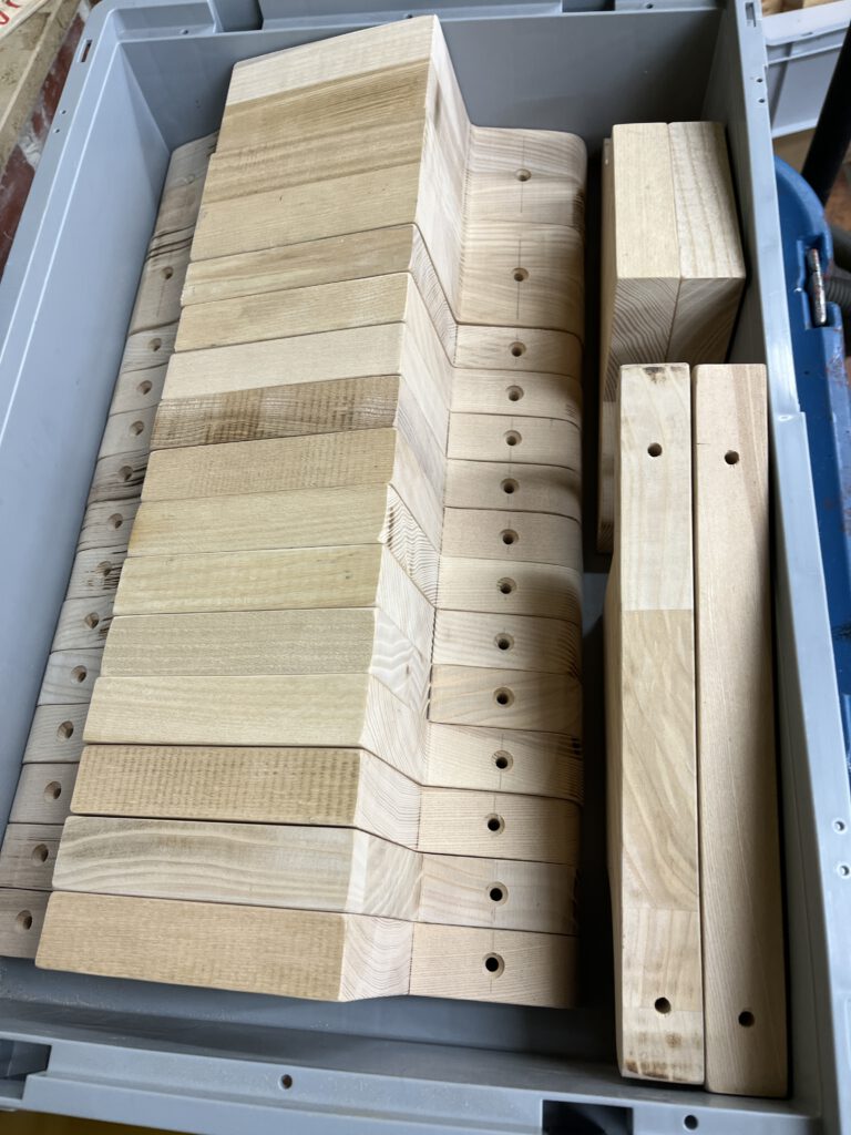 Einige unserer Mitstreiter sind mit der Neuanfertigung der Bodenlattung für den Tw 917 beschäftigt. Da kommt doch eine ganze Menge Holz zusammen, denn immerhin benötigen wir hier Material für fast zwei komplette Triebwagen.