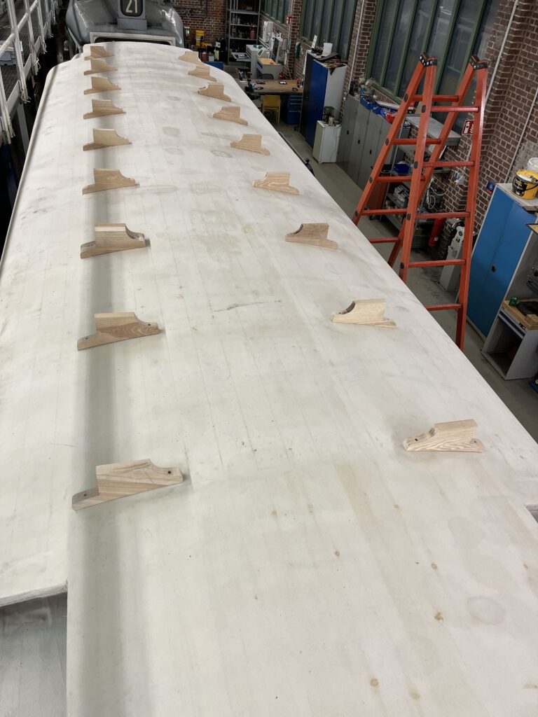 Als erstes noch ein Blick auf die nun vollständig wiederhergestellte Dachlattung der B-Plattform. Wir finden, dass uns das schonmal sehr gut gelungen ist. 🙂 (Foto: Rüdiger Grabowski)Nun begann ein längerer Arbeitsabschnitt, bei dem unzählige Schraubenlöcher, kleinere Risse und Fehlstellen zu verspachteln waren. Dies sah dann erst einmal so aus. (Foto: Rüdiger Grabowski)