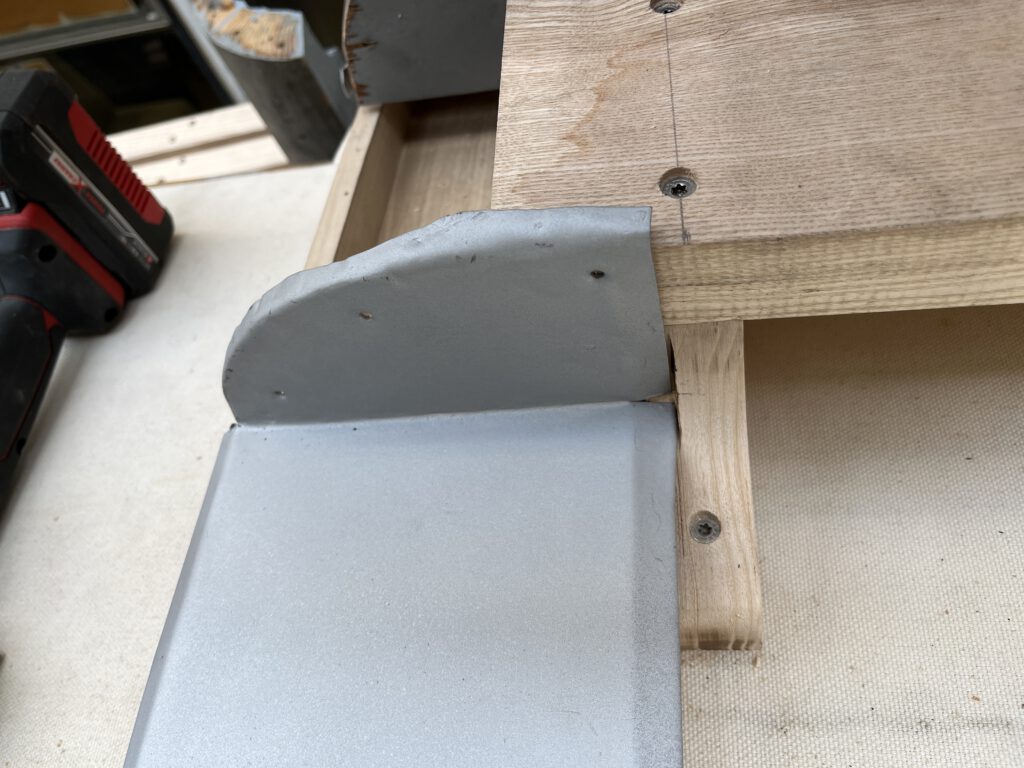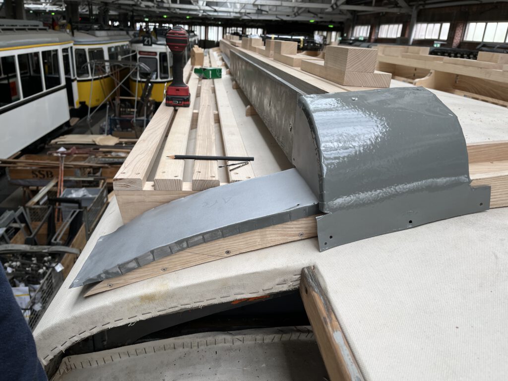 Alle anderen Bleche konnten wir aufarbeiten und anschließend haben wir dann alles einmal provisorisch zusammengebaut, um zu prüfen, ob noch irgendwo Anpassungen erforderlich sind. Hier passt soweit alles. (Foto: Rüdiger Grabowski)Für die mittlere Abdeckung mussten wir noch etwas nacharbeiten, mit der Bandfeile war die kleine Anpassung am Stützbock aber schnell realisiert,… (Foto: Rüdiger Grabowski)… so dass das Abdeckblech nun perfekt sitzt. Der ursprüngliche Bock an dieser Stelle war ausgesägt, jetzt wissen wir auch, warum. (Foto: Rüdiger Grabowski)Auch auf der B-Seite passt nach ein paar kleineren Modifikationen alles wieder zusammen. (Foto: Rüdiger Grabowski)Da soweit alles passt, kommen die ersten Teile nun in den Lack. Nach zahlreichen Reparaturen und Instandsetzungen fanden sich insgesamt vier verschiedenen Grautöne auf dem Dach, dem historisch richtigen Farbton aus den 1950er/60er Jahren kommt mausgrau RAL 7005 am nächsten. Im oberen Bildteil sieht man übrigens weitere Teile unseres DoT4-Tw 917, von dem in nächster Zeit auch wieder zu berichten sein wird. (Foto: Rüdiger Grabowski)Letzter Arbeitsschritt im Rahmen der Probemontage: Auf der rechten Wagenseite fehlten in der Kanalrückwand noch die Durchbrüche für die Kabel, diese haben wir nach Vorlage der alten Bretter mit dem Forstnerbohrer eingebracht. Ab der kommenden Woche werden wir alles wieder demontieren, damit die Holzteile konserviert und später lackiert werden können, außerdem bekommt dann auch die Dachhaut ihren Endanstrich. (Foto: Rüdiger Grabowski)